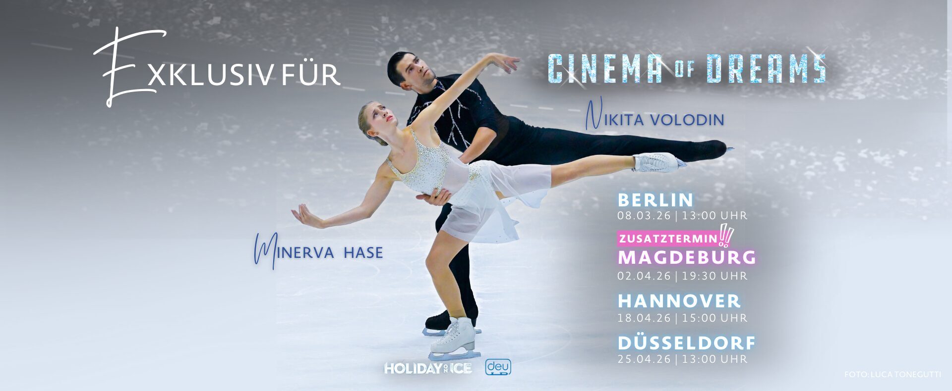 Ein echtes Highlight für alle Eiskunstlauf-Fans: Nach einer Saison mit großen internationalen Höhepunkten stehen Minerva Fabienne Hase und Nikita Volodin erstmals wieder für ein deutsches Publikum auf dem Show-Eis. Mit ihren exklusiven Auftritten bereichern sie die aktuelle HOLIDAY ON ICE Produktion CINEMA OF DREAMS um einen besonderen sportlichen Moment.
