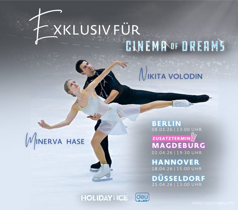 Nur noch bis Ende April 2026 verwandelt HOLIDAY ON ICE die größten Arenen Deutschlands in eine Traumfabrik auf dem Eis. Inspiriert von den großen Genres des Kinos entführt CINEMA OF DREAMS in eine Geschichte über Freundschaft, Fantasie und die Kraft, an Träume zu glauben. Atemberaubende Kulissen, opulente Kostüme, Akrobatik, Welt-Klasse-Eiskunstlauf und ein emotionaler Soundtrack verschmelzen zu einem Live-Erlebnis wie im Blockbuster.